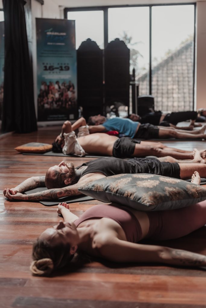 You practice from your own space — lying down, sitting, or standing.